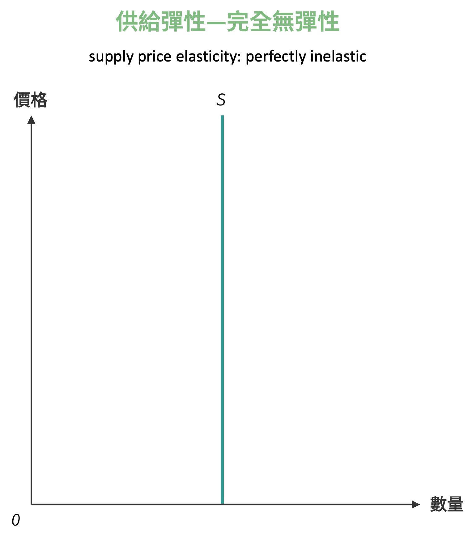 完全無彈性代表無論價格為何,供給量皆為定數,亦即供給量不受價格變動的影響,因此供給量變動百分比為零。完全無彈性之供給曲線為垂直線,如下圖所示: