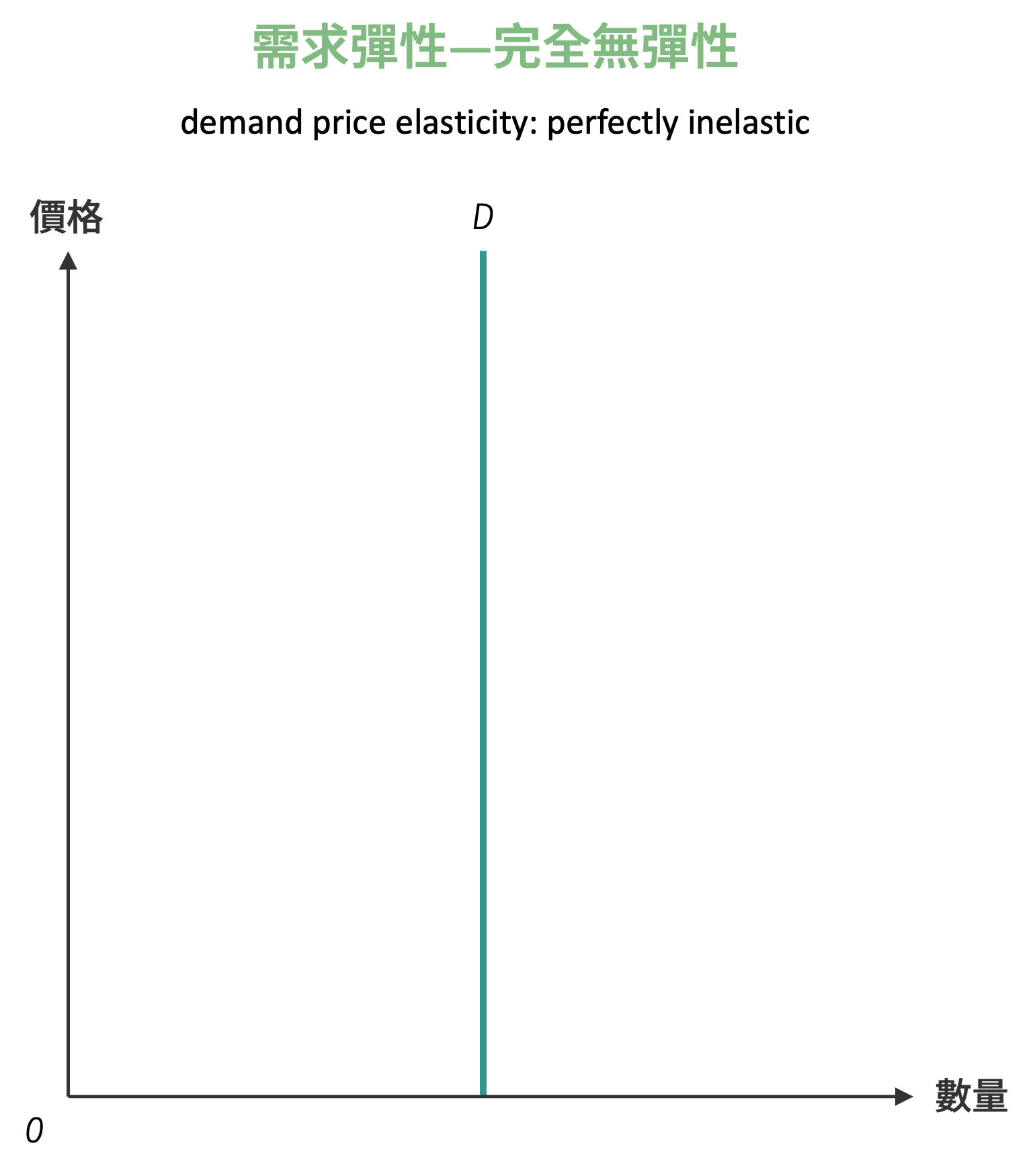 完全無彈性 (perfectly inelastic) 代表無論價格為何,需求量皆為定數,亦即需求量不受價格變動的影響,因此需求量變動百分比為零。