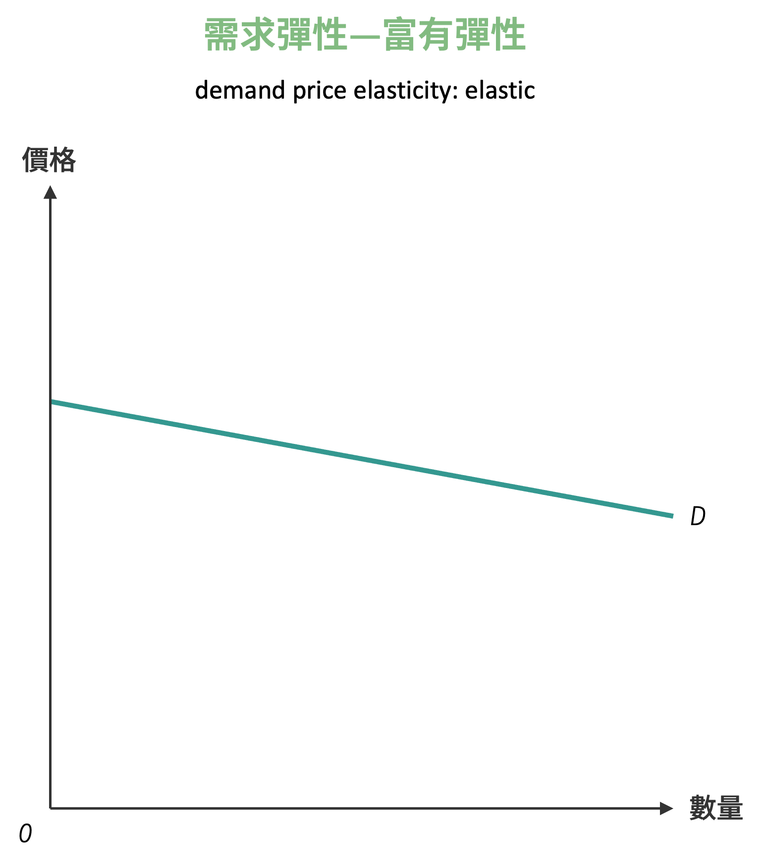 富有彈性 (elastic) 代表需求量變動百分比絕對值大於價格變動百分比絕對值。此時彈性大於 1。需求曲線平緩向下傾斜,如下圖所示: