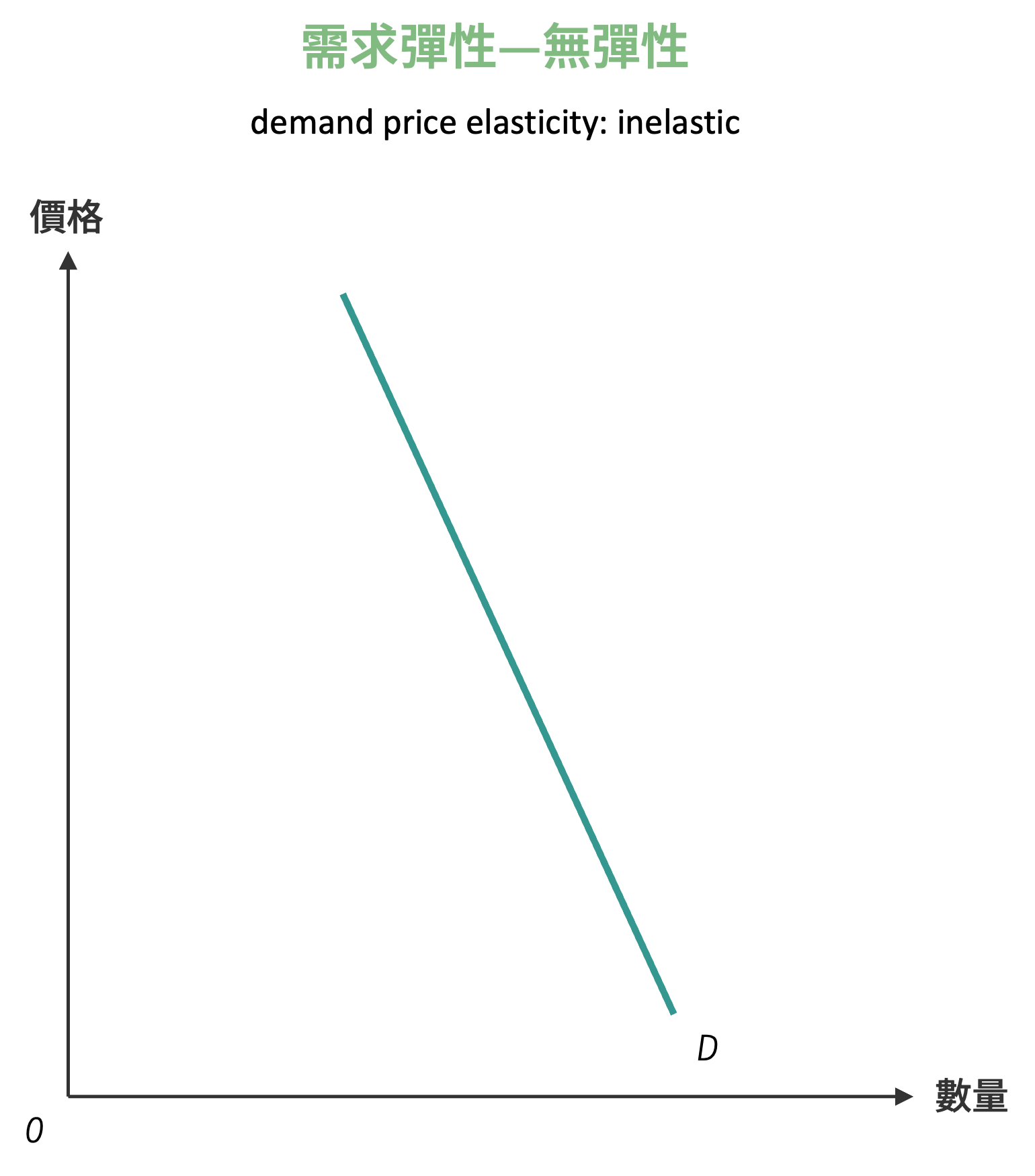 無彈性 (inelastic) 或稱缺乏彈性,其需求量變動百分比小於價格變動百分比。需求曲線陡峭向下傾斜,如下圖所示:
