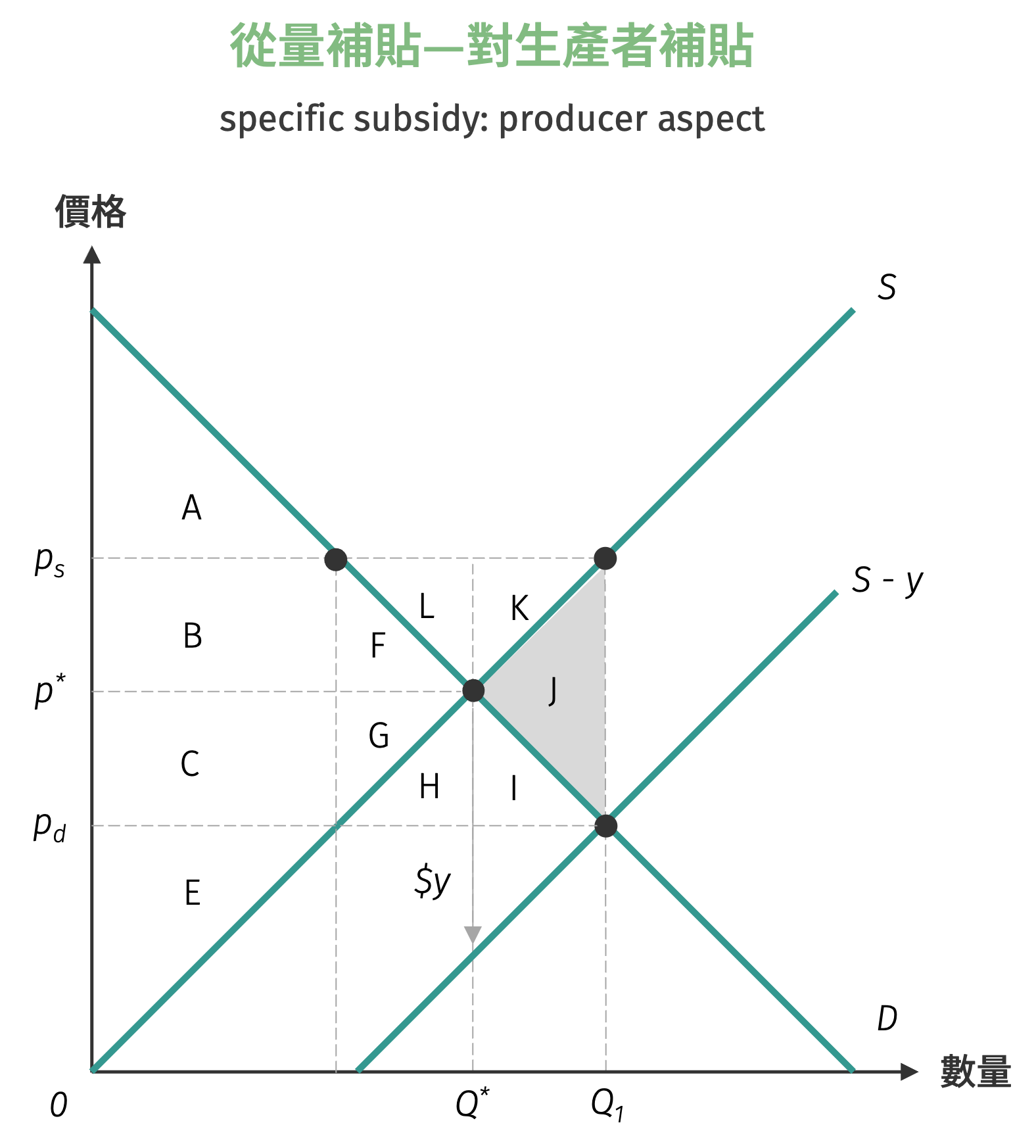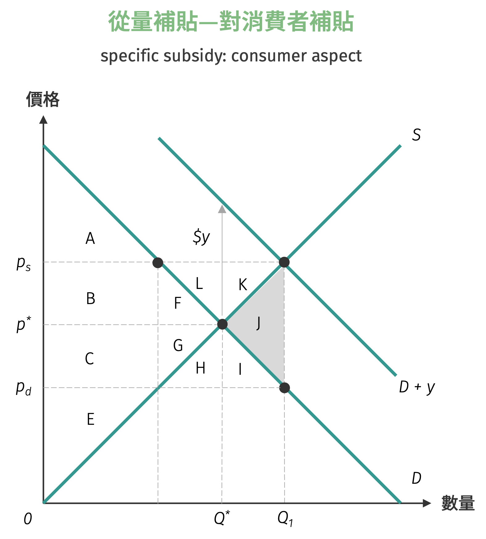 補貼實施後,消費者實際支付的價格從 \(p^*\) 下降至 \(p_d\),生產者實際收到的價格則從 \(p^*\) 上升至 \(p_s\),其中 \(p_s - p_d = s\) (補貼金額)。