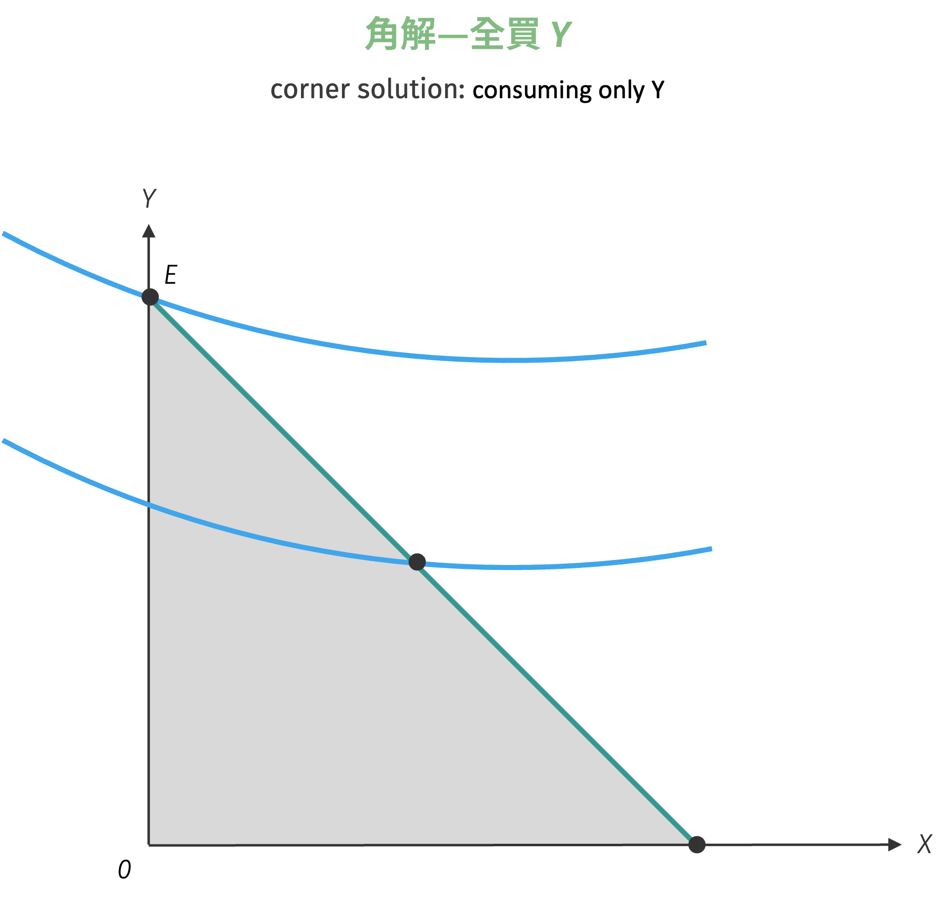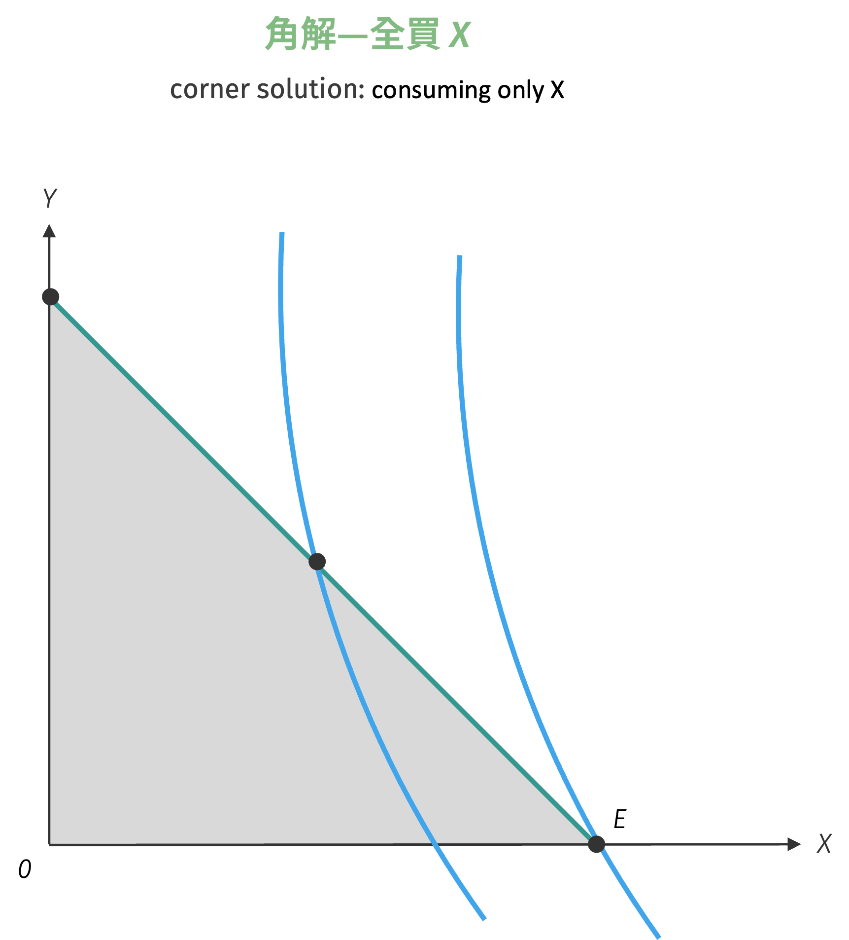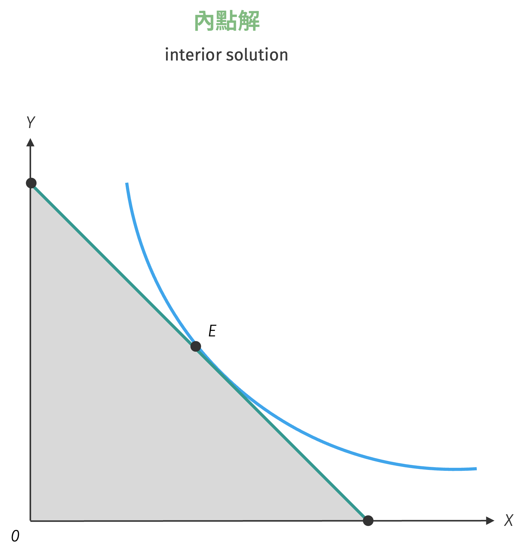 注意到,切點條件僅適用於內點解的情況。當最適解出現在預算線的端點時 (即消費者完全不消費某種商品) ,我們得到的是邊界解,此時切點條件不再適用。