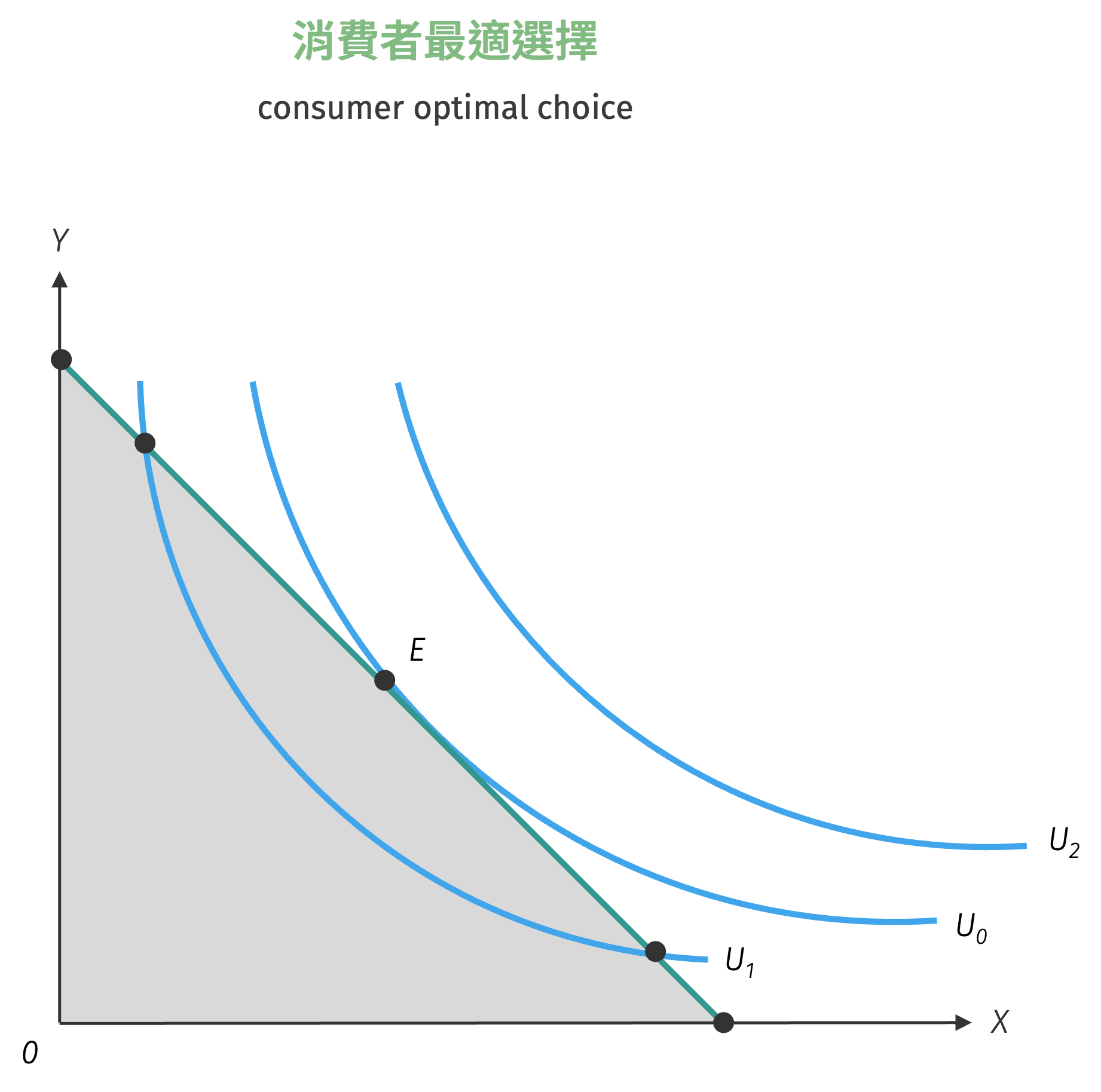 - 最適性條件:在所有可行點中,該點必須位於最高的無異曲線上