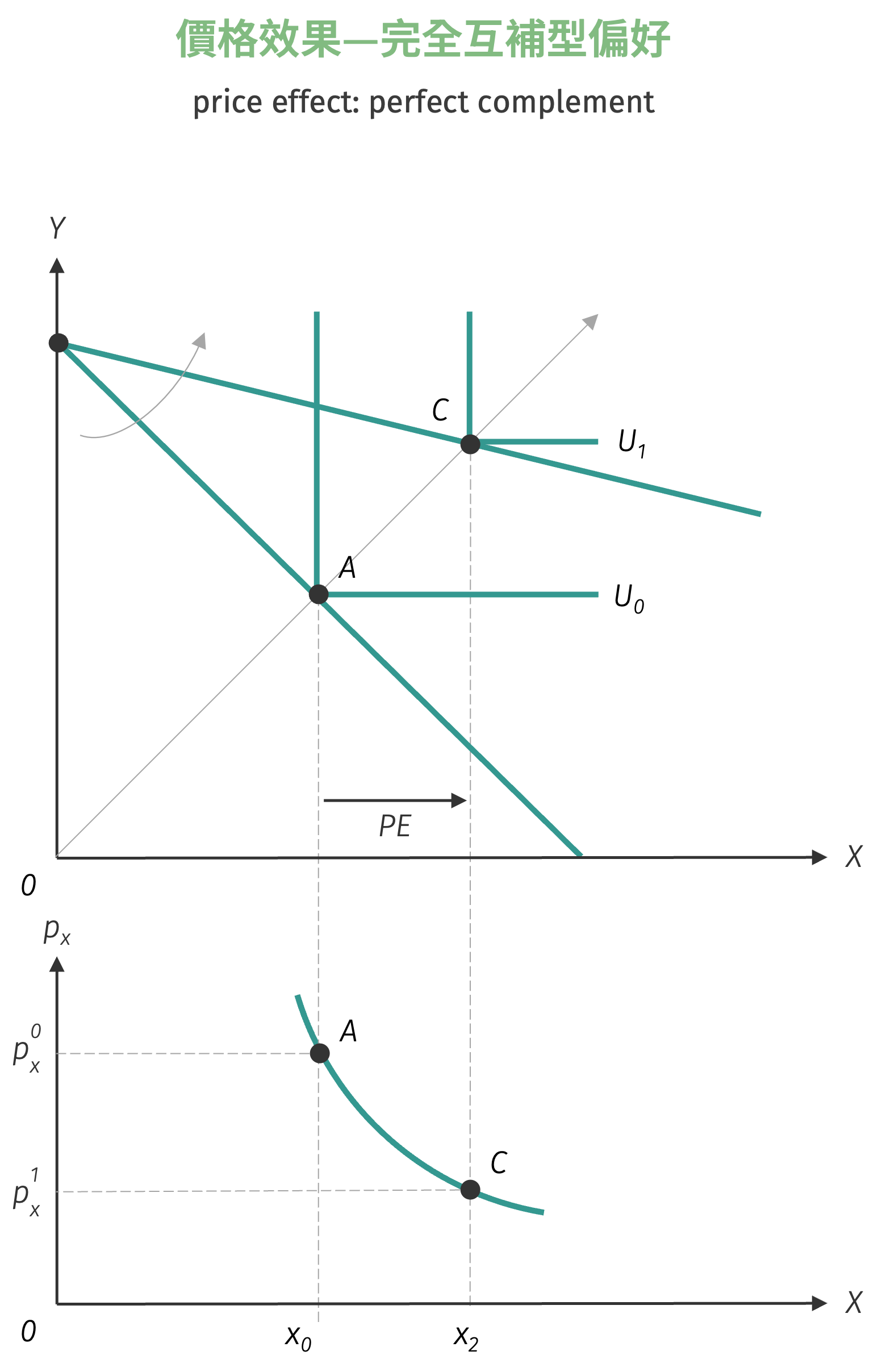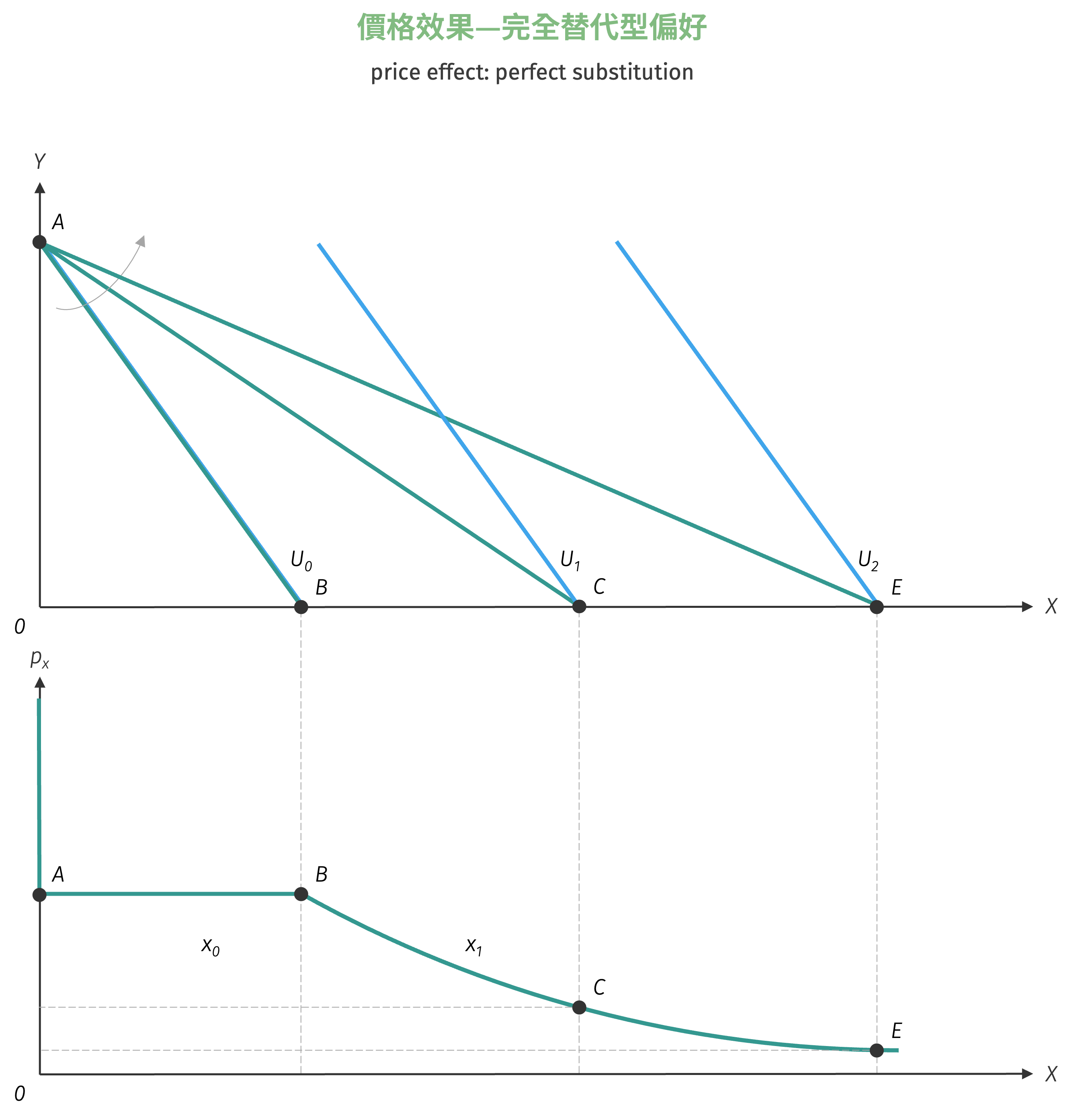 首先為完全替代型偏好,當 \(x\) 商品價格高於 \(p_x^0\),如上方預算限制式為 AB 線段時,當預算限制線 \(x\) 商品價格逐漸下跌後,當預算限制線與消費者最適選擇下之 \(x\) 消費量為 0,隨著 \(x\) 商品價格逐漸下跌後,亦即 \(x\) 商品價格為 \(p_x^0\) 時,\(x\) 之最適消費數與 \(U_0\) 效用水準之無異曲線重疊時,開始消費者的選擇,因此此時 \(x\) 商品的消費量可能是預算限制式上任何一點,開始消費者的選擇,因此此時 \(x\) 商品需求量隨價格數量可能由 0 到 \(\frac{M}{p_x^0}\),當 \(x\) 商品價格下跌至小於 \(p_x^0\) 時,則 \(x\) 商品需求量隨價格下跌而增加,如無異曲線圖形所示,此時不論價格下跌至何種水準,消費者最適選擇皆為角解僅消費 \(x\) 商品,故需求曲線呈現負斜率且漸進趨近於 \(x\) 軸。