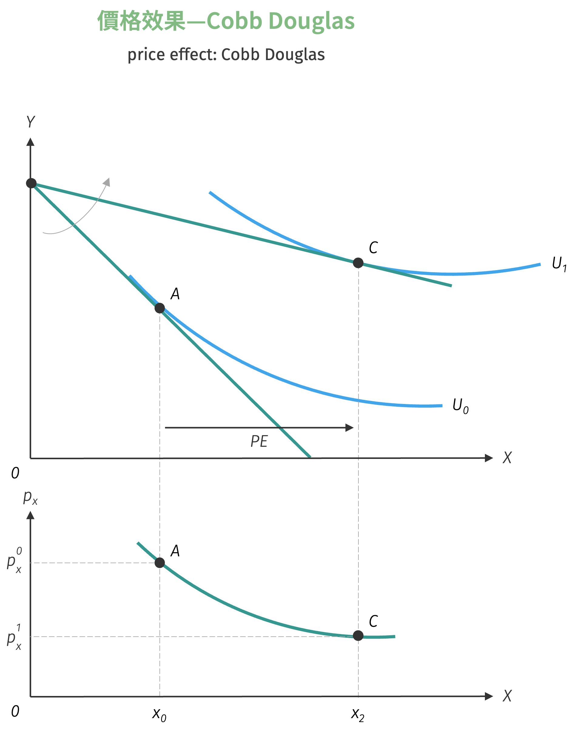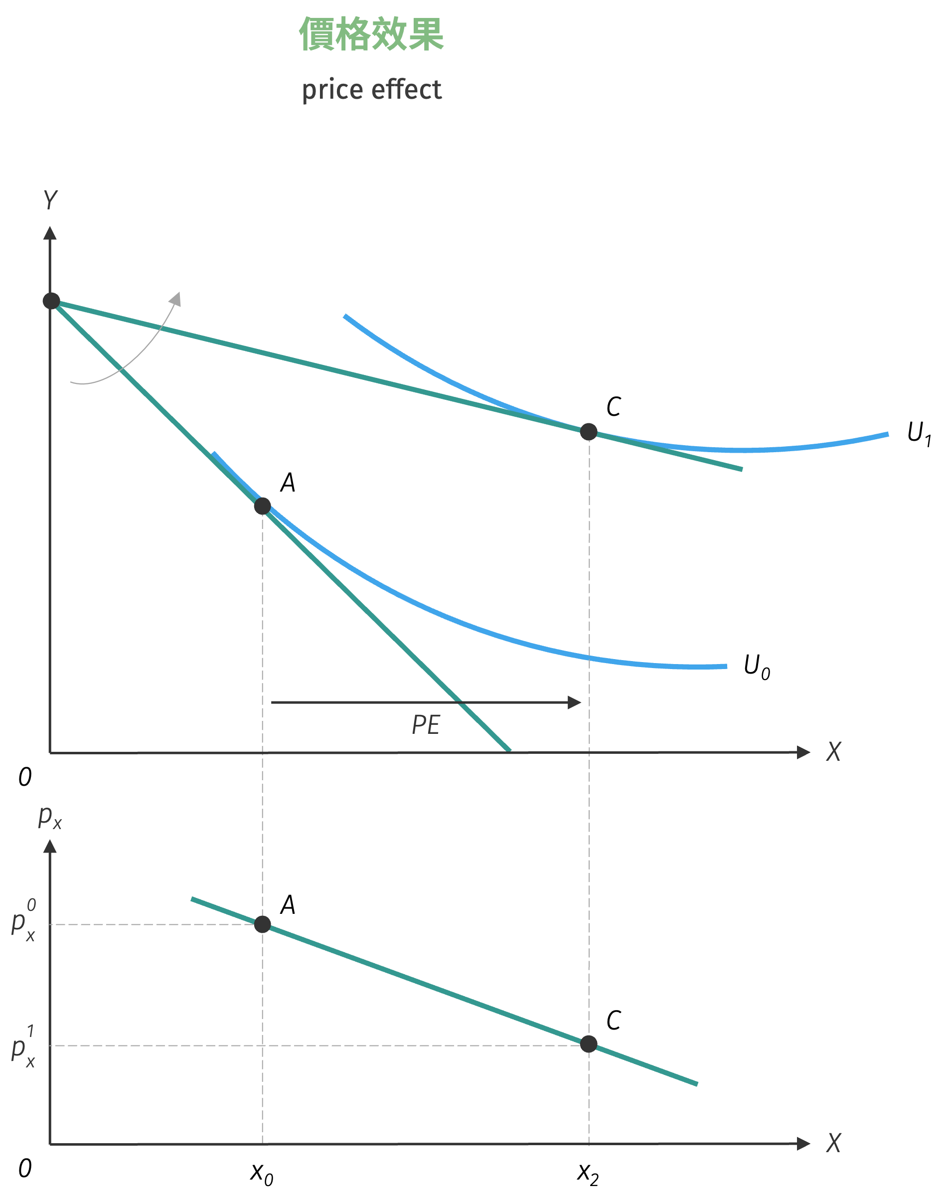 繪製價格效果之方式,以 \(x\) 商品為例,給定消費者偏好的無異曲線 (假設符合無異曲線所有良好的假設) 與其面對的預算限制式,以及價格變動的幅度,記變動前為 \(p_{x}^{0}\),變動後為 \(p_{x}^{1}\)。在價格變動後,預算限制式會旋轉,並與無異曲線相切,得到 \(x\) 在價格變動前後的最適需求量,記作 \(x_{0}\) 與 \(x_{2}\),則 \(\Delta x = x_{2} - x_{0}\) 即為價格效果。 接著在 \(x\)-\(y\) 平面下方繪製價量平面,橫軸為 \(x\)、縱軸為 \(p_{x}\),將上述步驟得到的價量組合繪製在平面上並連線,即可推導出 \(x\) 的需求曲線。