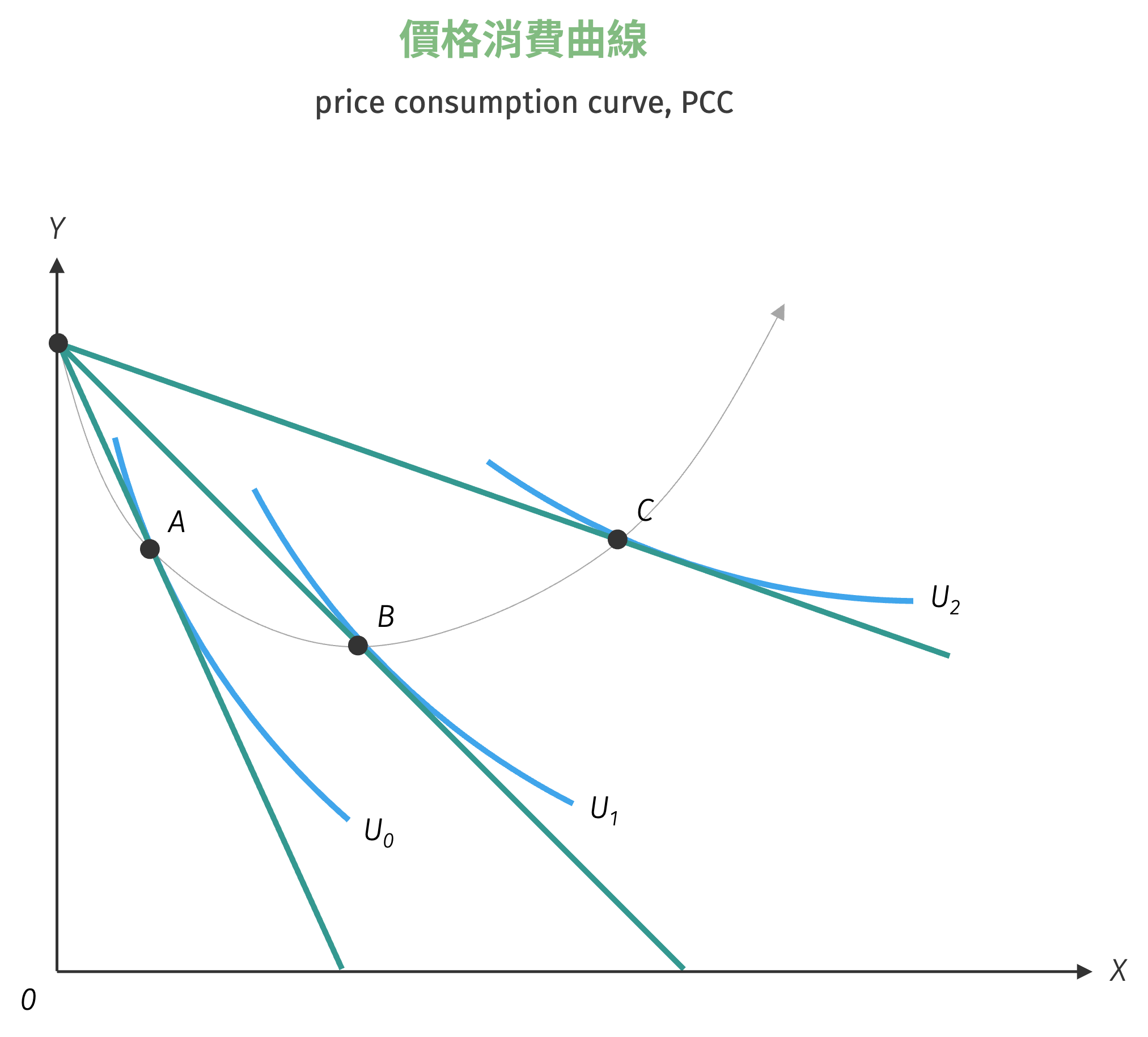 在其他商品價格與消費者所得不變之下,消費者對於特定商品在各種不同的價格下,消費者最適消費選擇組合點的連線,稱之為價格消費曲線 (price consumption curve, PCC),又稱為價格擴張曲線 (price expansion path) 或價格提供曲線 (price offer curve)。