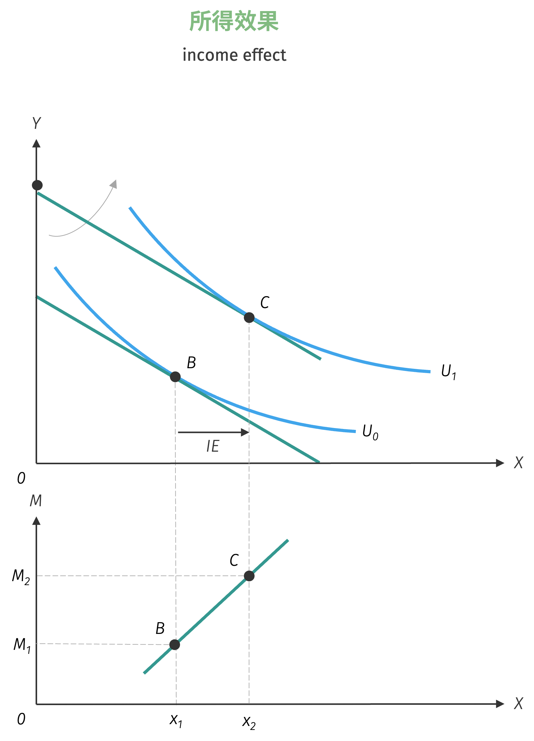 原消費者最適選擇為 B 點,當消費者所得增加後,會使得預算限制式向外平行外移,從而擴大預算集合,因此消費者最適選擇將會由 \(U_1\) 選擇至效用更高的 \(U_2\) 消費,因而得到新的最適選擇點 C 點。原本需求量為 \(x_1\),所得增加後為 \(x_2\),所得效果為 \(\Delta x = x_{2} - x_{1}\),記成 IE。