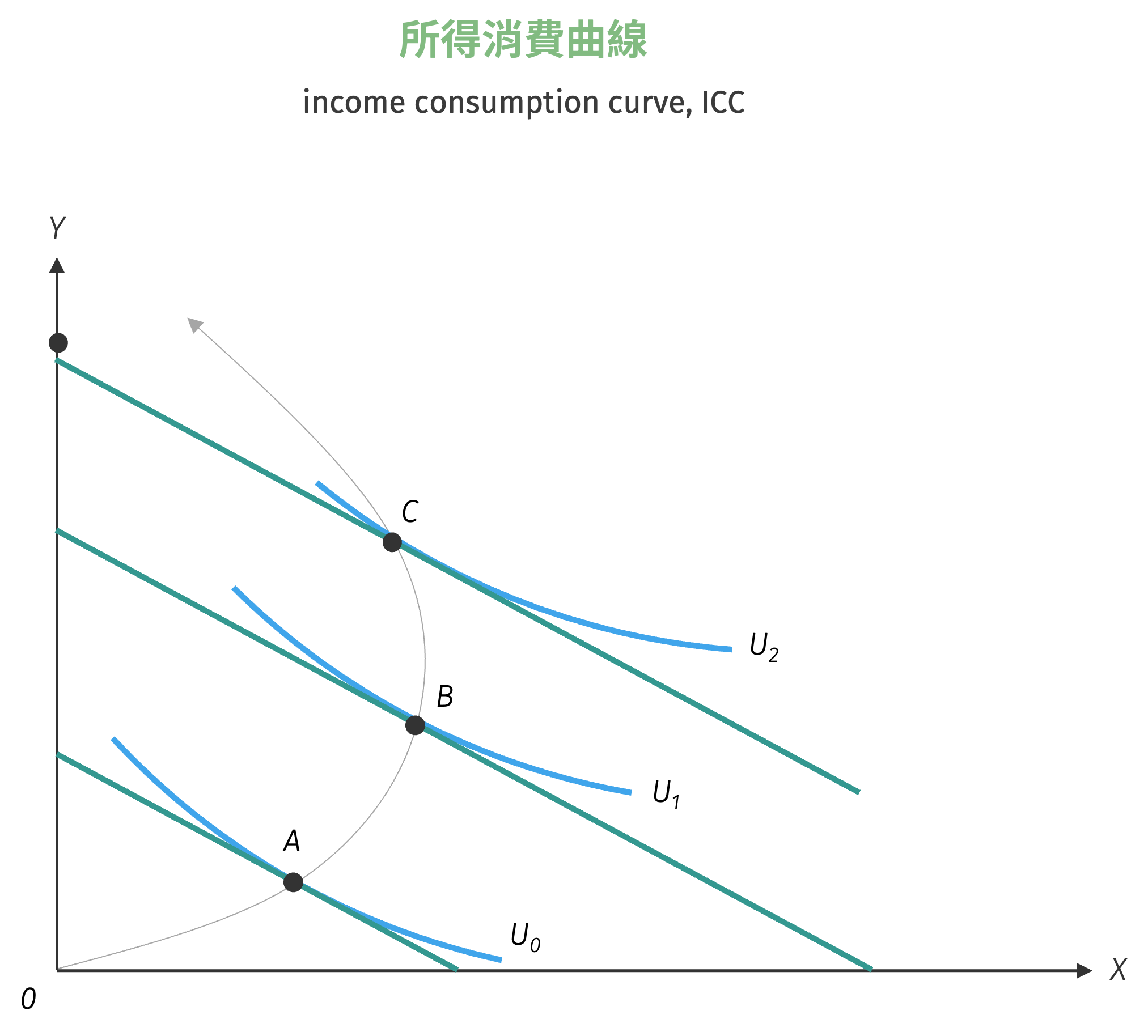 如下圖所示,隨著所得持續增加,消費者最適選擇均衡點亦逐漸由 A 點過向 B 點及 C 點,因此所得消費曲線亦即前述所得效果的應用,故可由所得消費曲線來推導消費者對特定商品的恩格爾曲線。一般而言所得消費曲線的出發點為原點,表示當所得為零時,消費者對於 \(x\) 與 \(y\) 兩商品的最適選擇亦皆為零。當所得消費曲線為正斜率時,表示時,消費者對於 \(x\) 與 \(y\) 兩商品的最適選擇亦皆為零,若所得消費曲線為呈現負斜率的區段,則表示其中一種商品必為劣等財。