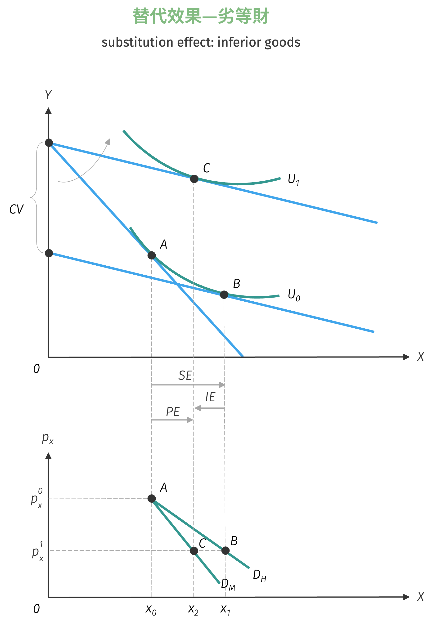 根據劣等財的定義:當所得上升後,反而會減少特定商品的消費數量。因此在下圖中,實質所得增加後,消費量卻減少了。此時替代效果強於反向的所得效果,因此價格效果仍會推升 \(x\) 商品的消費數量。