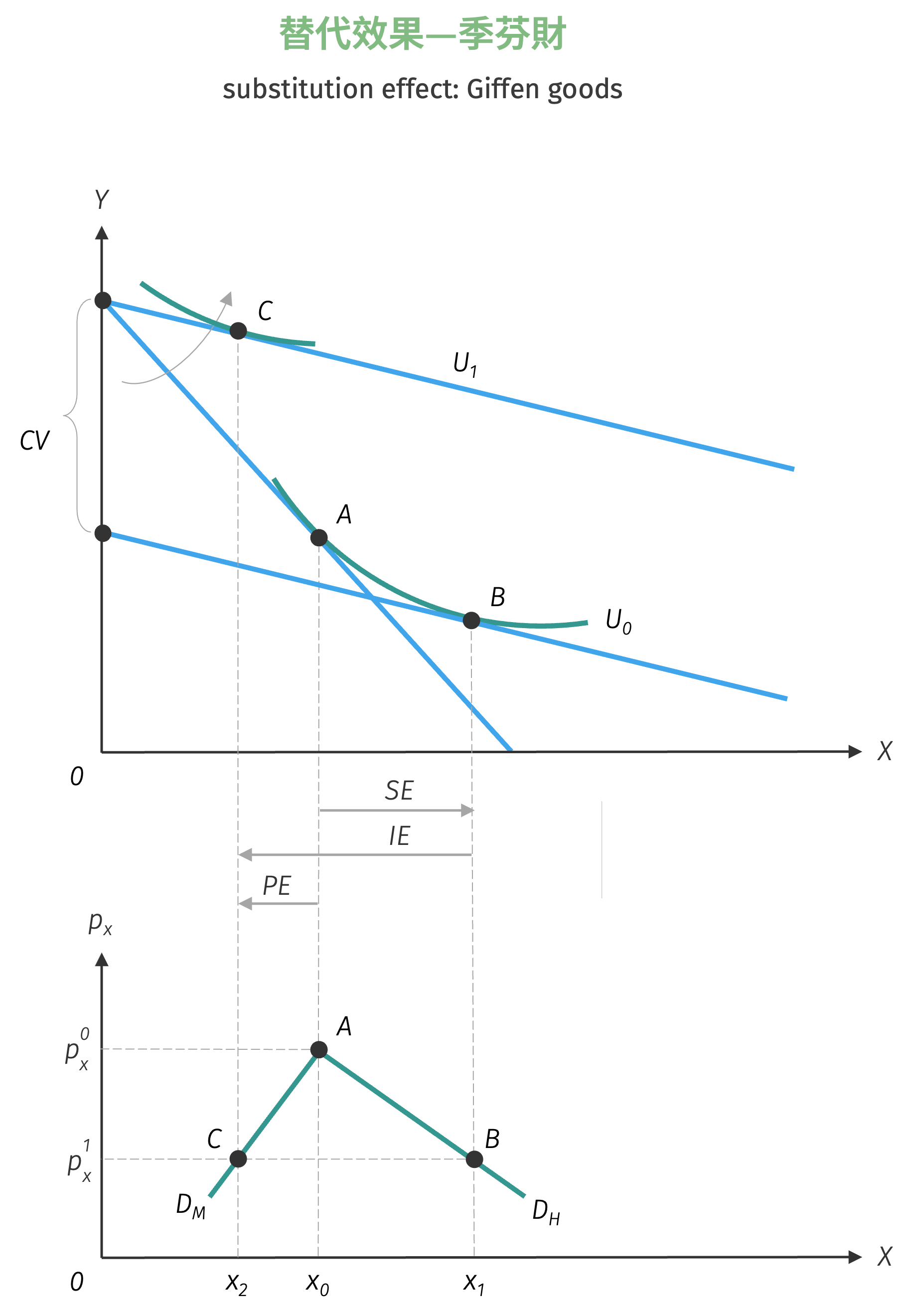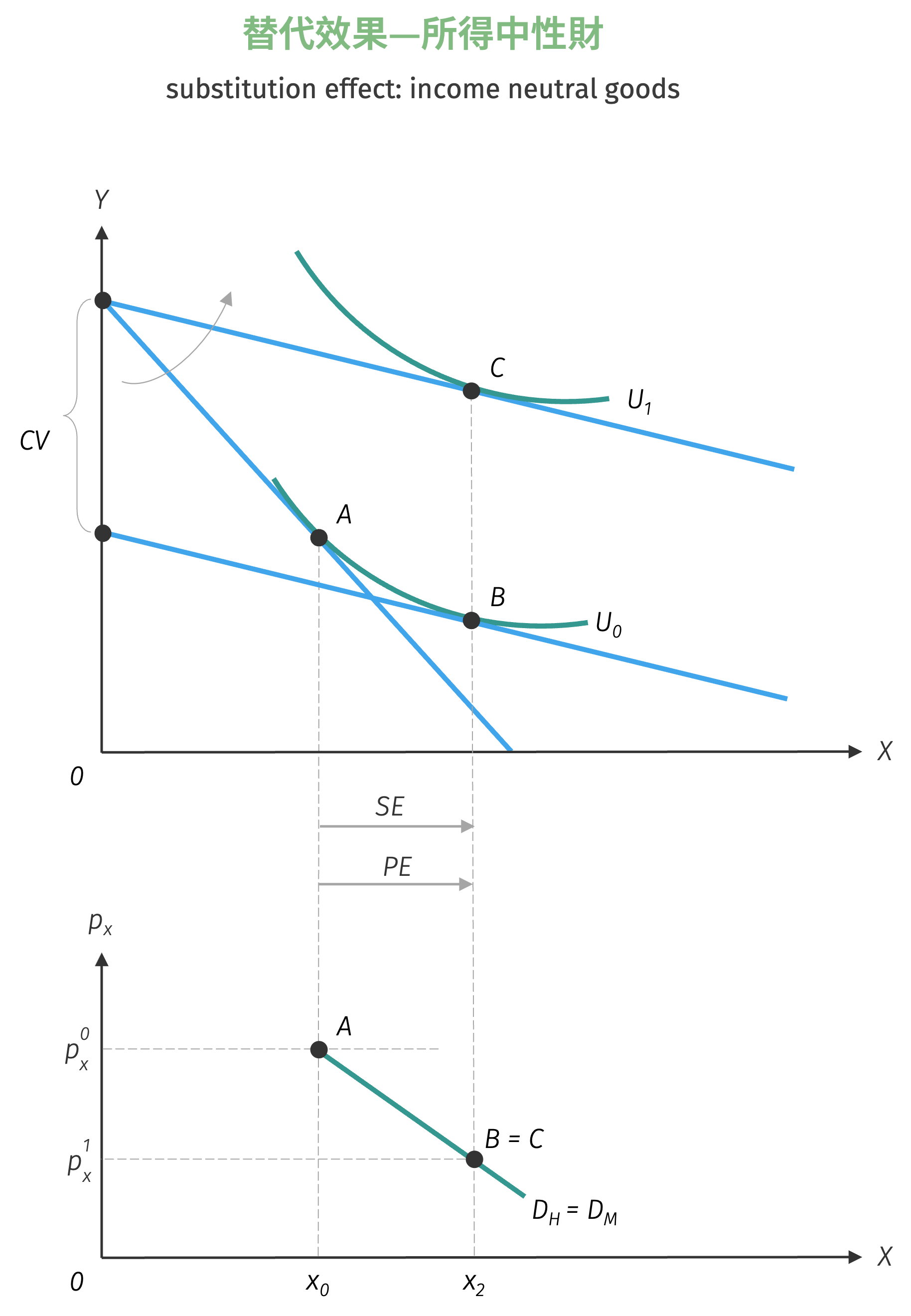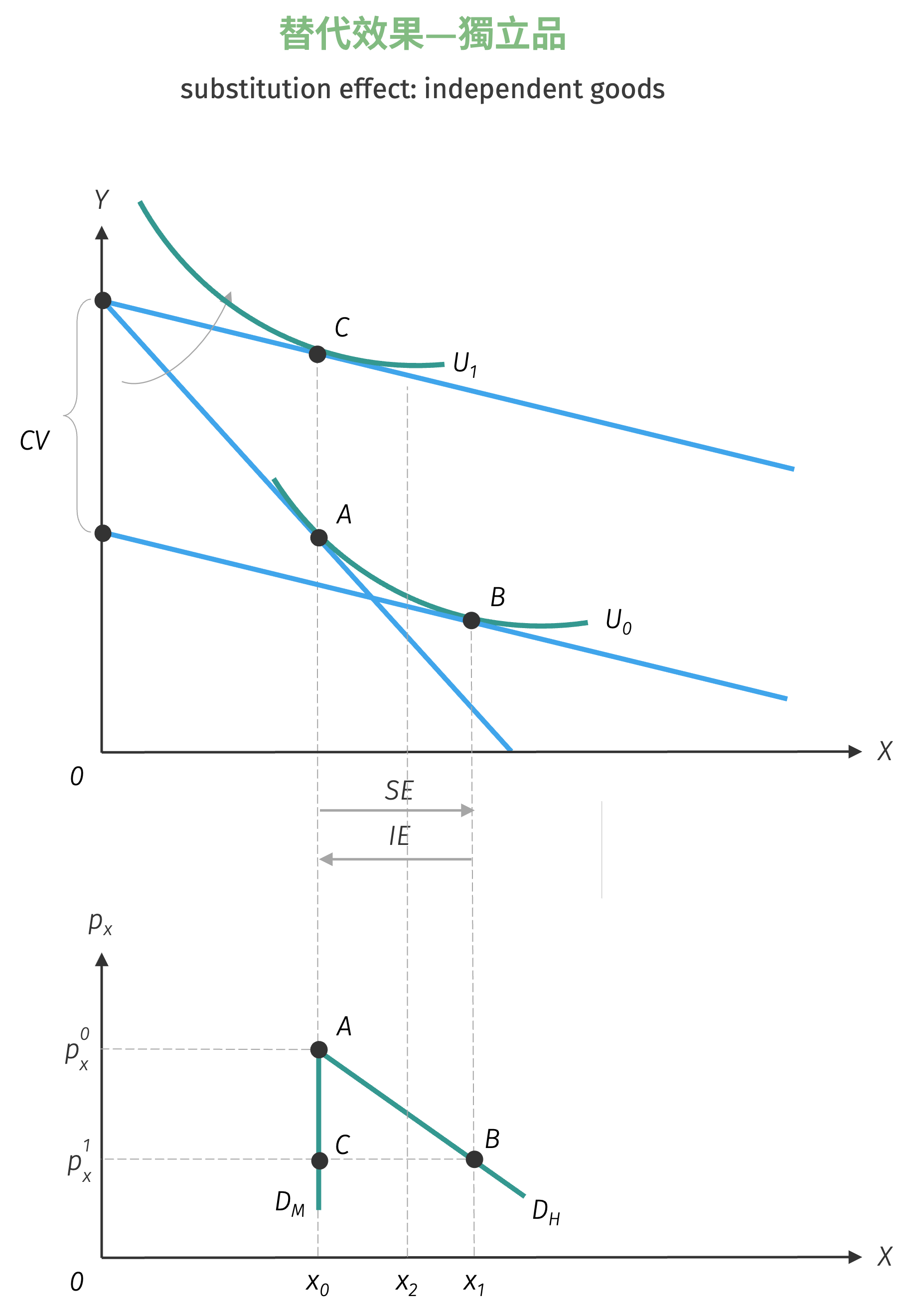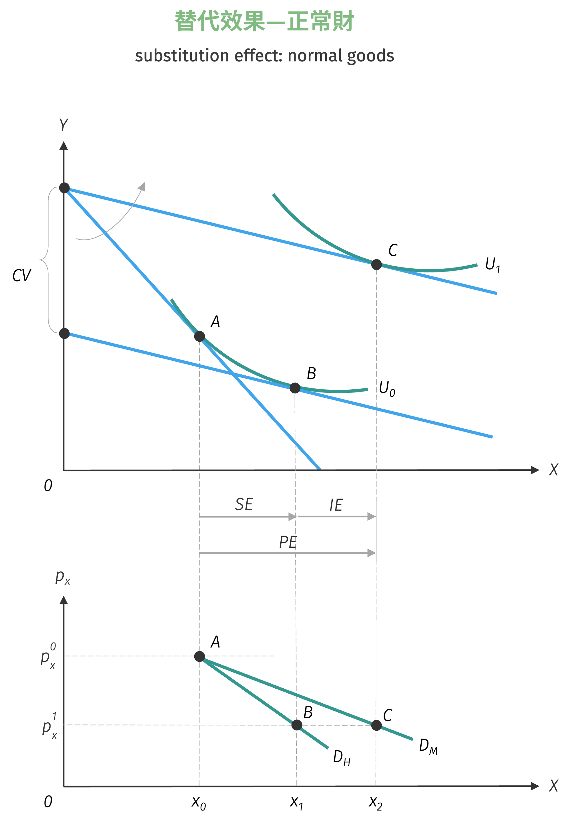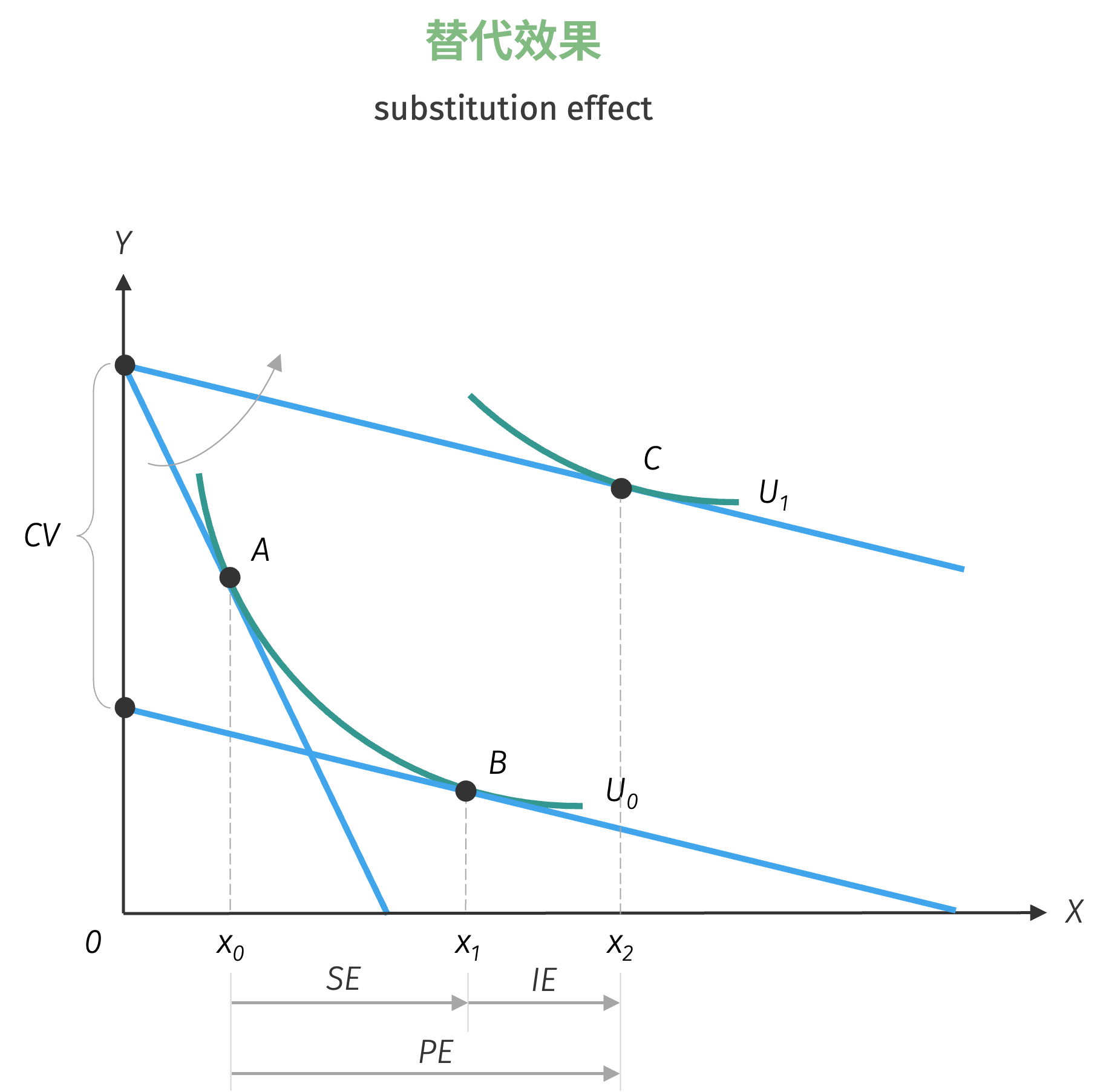 如下圖所示,設原預算限制式為 \(B_0\) 線段,消費者最適選擇為 A 點之效用水準 \(U_0\)。當 \(x\) 商品相對價格下跌後,會使得消費者的預算限制式虛轉右移至 \(B_2\) 線段,新的消費者最適選擇為 C 點之效用水準 \(U_1\),此時名目所得不變,但消費者的實質所得會因為預算集合擴大而增加,為使消費者在商品相對價格下跌後,仍然維持在先的 \(U_0\) 效用水準,扣除補償變量後消費者之預算限制式將由較鬆弛的 \(B_0\) 移至較平且之 \(B_1\),顯示出 \(x\) 商品相對價格下跌商品 (預算限制式由較傾斜的 \(B_0\) 移至較平且之 \(B_1\),顯示 \(x\) 商品相對價格下跌或說 \(y\) 商品相對價格上漲),如圖形中的 A 點至 B 點,\(x\) 商品消費數量增加而 \(y\) 商品消費數量減少的過程,稱為替代效果,以圖形中之 SE 表達。